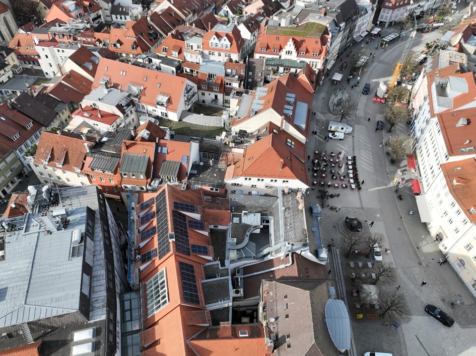 So kamen unterschiedliche Montagesysteme zum Einsatz und hinsichtlich des Gerüstbaus in der Fußgängerzone war auf die Erfüllung spezieller Sicherheitsvorschriften zu achten. Zudem durften aus Gründen des Denkmalschutzes auf der vorderen Dachseite keine PV-Module angebracht werden. Die geplante Anlagenleistung von 56,62 kWp war daher auf einer relativ kleinen Fläche unterzubringen.
